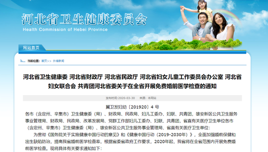 ![]() 日前,河北省卫生健康委、河北省财政厅等六部门印发通知,明确提出,为全面加强婚前保健和出生缺陷防治,提高河北婚前医学检查率,2020年起,河北将在全省范围内开展免费婚前医学检查。 ![]() 高度重视,提高对婚前医学检查工作的认识 婚前保健是对准备结婚的男女双方,在结婚登记前进行的婚前医学检查、婚育健康指导和咨询服务,是保障出生人口素质,预防出生缺陷的第一道防线,事关家庭和谐幸福和后代的健康成长,是法定母婴保健服务和生育全程服务的重要内容,事关家庭和谐幸福和后代的健康成长。省委、省政府高度重视免费婚检、孕检工作,主要领导同志明确要求,要免费开展婚前健康检查、孕前优生检查,超前发现、及时治疗婚育方面的疾病,最大限度降低新生儿疾病和残疾发生,并列入督查督办的重要事项省委书记王东峰在调研卫生健康工作时要求,免费开展婚前健康检查、孕前优生检查,超前发现、及时治疗婚育方面的疾病,最大限度降低新生儿疾病和残疾发生。免费婚检、孕检已经被列入省委省政府重要督办任务。各地要提高政治站位,充分认识实行婚前保健制度, 坚持婚前医学检查对有效控制传染性疾病,预防生殖系统疾病,提高人口素质的重要意义,将这项工作作为落实“不忘初心、牢记使命”主题教育重要内容,列入惠民、利民重大民生工程,周密部署,认真组织实施。 加强组织领导,依法推进婚前保健服务 各地要贯彻执行《中华人民共和国婚姻法》,按照《中国妇女儿童发展纲要(2011—2020年)》《中国儿童发展纲要(2011—2020年)》(简称“两纲”)和《河北省妇女发展规划(2011-2020年)》《河北省儿童发展规划(2011-2020年)》(简称“两规”)要求,以及我省卫生健康委等11部门《关于统筹推进出生缺陷综合防治工作的指导意见》的要求,在各级党委和政府领导下,多部门协同行动,2020年在全省范围内全面铺开免费婚前医学检查工作。我省将把这项工作作为妇幼健康绩效考核的重要内容纳入2020年绩效考核工作中。各市、县要加强组织领导,将此项工作作为政府和各部门实施“两纲”“两规”工作重点,列入卫生健康重要工作议事日程,采取积极有效的措施,加大部门协作,完善工作机制,确保2020年底实现婚检率50%的目标。各地要根据本地实际,在保证婚前医学检查基本内容不缺项的情况下,开展有特色的保健服务。市、县财政要将免费婚前医学检查工作列入重大民生工程基本公共卫生服务项目,合理确定检查标准,结合群众检查意愿、本地实际和财力情况,在本地现有保障政策和资金渠道的基础上,不足资金不足部分可以统筹使用上级和本级基本公共卫生服务项目新增部分资金、历年结余资金以及新划入项目补助资金部分予以保障,省级财政根据项目实施情况予以奖补。 坚持以人为本,优化全程服务 各地要充分认识免费婚检工作对于出生缺陷防治工作的重要意义,树立以人为本的服务理念,优化流程、规范操作,配齐所需设备和核设施,开发适宜宣传材料,运用人际交流技巧,提高服务质量和水平。要积极整合资源,采取多种形式,开展便民利民惠民服务,如婚登婚检就近就便设置,婚登机关配合婚检机构做好和婚检告知和、健康教育一并(“一站式”)服务,婚检在线预约、检查结果提醒查询等措施,改善服务体验,让群众“更便捷”。(实行婚前保健服务机构与婚姻登记机关“一站式”服务。)实行婚前保健服务机构与婚姻登记机关“一站式”服务,加强婚前医学检查与孕前优生健康检查项目优化整合,借鉴推广先进地区的工作经验,逐步实行一条龙服务的新模式、新做法,真正做到让目标人群“跑一次道,进一次门,抽一次血,享受两项服务”,提高婚检率和孕前优生健康检查目标人群覆盖率。2020年1月起,婚检实行月报制,每月5日前报市级妇幼保健院,10日前由市级妇幼保健院汇总后报省妇幼保健中心,同时报市级卫生健康行政部门。 加大宣传力度,提高群众参与率 婚前医学检查是利国利民的好事,需要群众的积极参与才能见到实效。各地要将健康教育与婚前医学检查工作并重,采取群众喜闻乐见的形式,发挥传统媒体和新媒体的特色优势,广泛开展宣传教育,提高群众对婚前医学检查、孕前优生健康检查重要性的认识。卫生健康部门联合民政部门,结合实际在婚姻登记场所设立婚育健康宣传教育便民服务平台或婚姻家庭健康咨询室,向婚育人群开展针对性宣传教育和咨询指导,普及优生科学知识,引导群众关注婚期、孕前健康,转变行为习惯,提高群众参加婚前医学检查的主动性和参与性,增强合力确保完成目标任务。 密切部门协作,确保婚检工作取得实效 各地各单位要切实增强对婚前保健工作的认识,加强组织领导,密切部门协作,完善政策措施,确保《健康中国行动(2019-2030年)》《中长期青年发展规划(2016-2025年))和中国妇女发展纲要、中国儿童发展(简称“两纲”“两规”)相关目标任务落实。卫生健康部门要履行主体责任、加大统筹协调和资源整合力度,狠抓机制完善和能力建设,着力加强婚前孕前保健咨询与指导,确保婚前保健、孕前优生健康检查等服务和政策更加公平可及。财政部门要加大支持力度,积极推进政府买单,特别是贫困地区的免费婚检工作。民政部门要配合做好婚前保健工作,切实保障婚姻当事人合法权益。妇儿工委办公室要聚焦“两