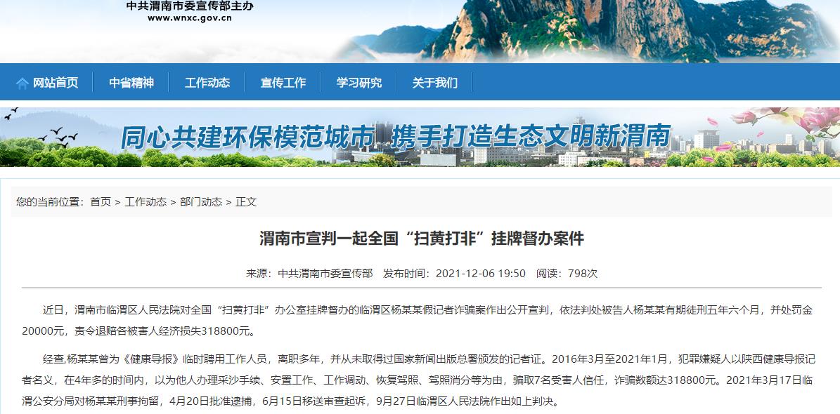 原标题:渭南市宣判一起全国“扫黄打非”挂牌督办案件 近日,渭南市临渭区人民法院对全国“扫黄打非”办公室挂牌督办的临渭区杨某某假记者诈骗案作出公开宣判,依法判处被告人杨某某有期徒刑五年六个月,并处罚金20000元,责令退赔各被害人经济损失318800元。 2021年3月17日临渭公安分局对杨某某刑事拘留,4月20日批准逮捕,6月15日移送审查起诉,9月27日临渭区人民法院作出如上判决。 |