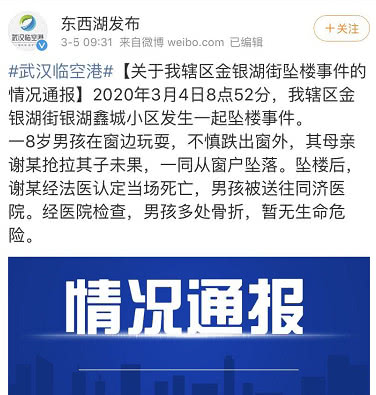 3月5日,武汉东西湖区人民政府微博发布,关于辖区金银湖街坠楼事件的情况通报。2020年3月4日8点52分,我辖区金银湖街银湖鑫城小区发生一起坠楼事件。