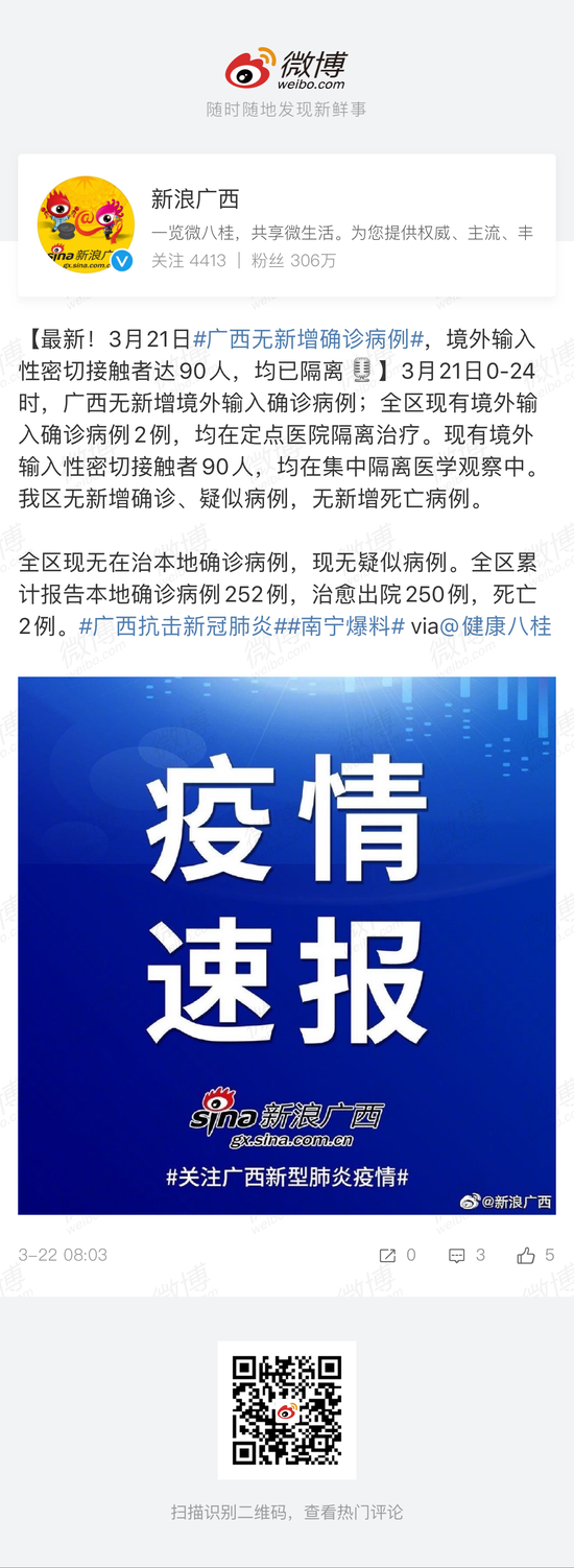 3月21日0-24时,我区无新增确诊、疑似病例,无新增死亡病例。全区现无在治本地确诊病例,现无疑似病例。全区累计报告本地确诊病例252例,治愈出院250例,死亡2例。